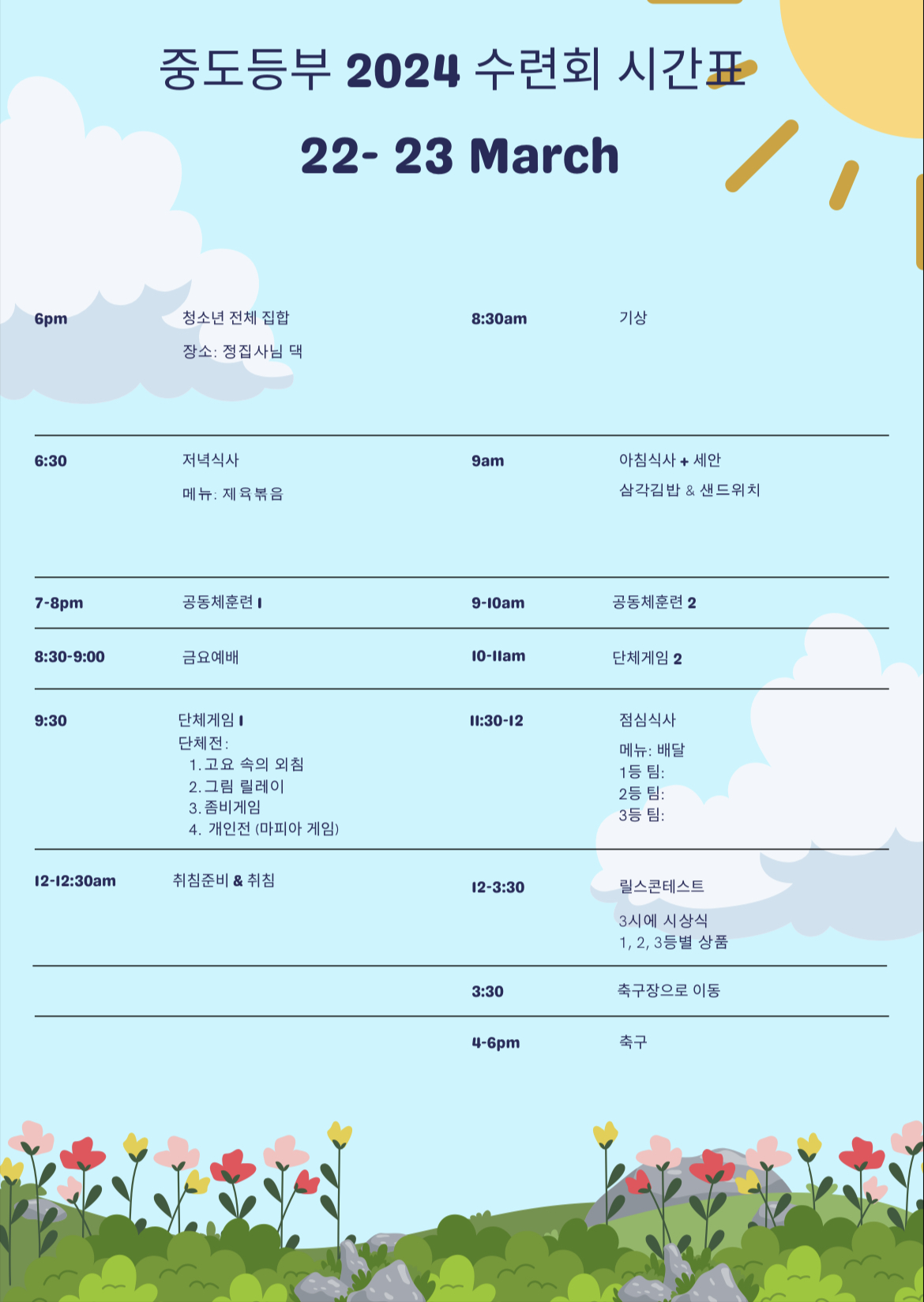 공동체캠프2(아침식사,공동체훈련2,공동체게임2,점심식사,릴스콘테스트,축구)